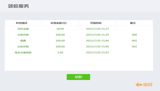 2.领款服务:用户密码输入正确,则进入领款查询界面,并显示可领款项;用户点击领款后,逐条领取未领款项,直至结束;领款中途移走卡片,则停止或形成未决,等待系统自动或手工处理。