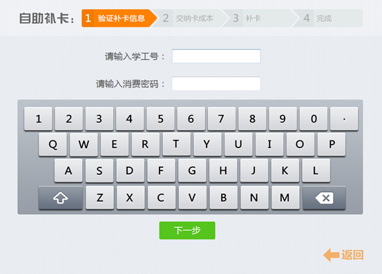 2.验证账户信息:用户需输入账户信息(目前为学工号和用户消费密码);点击下一步时,将进行账户信息验证;账户信息验证如失败会有提示,如验证成功将继续验证身份证信息。