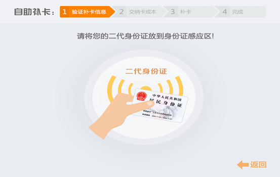 4.验证身份证信息:用户需放置账户对应的二代身份证,以完成验证;如验证失败会有提示,如验证成功即可检查卡状态;如校园卡已挂失,直接进入下一步;如正常校园卡会提示先进行挂失操作。