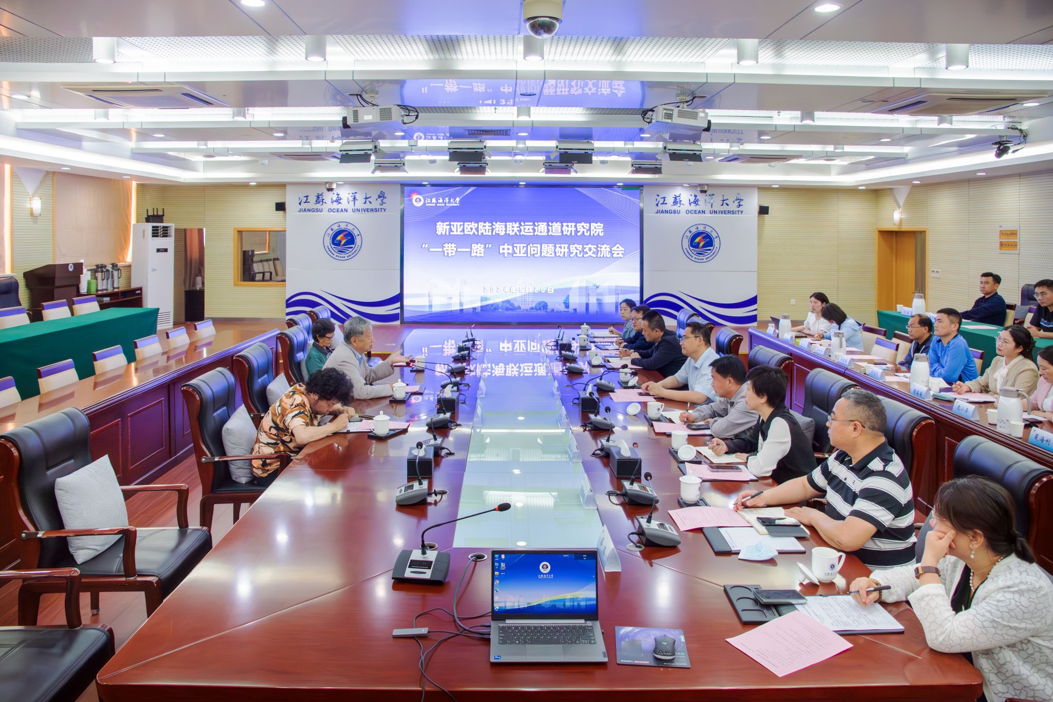 2024年5月20日下午,新亚欧陆海联运通道研究院“一带一路”中亚问题研究交流会学术中心东海厅举行。兰州大学原副校长、现中亚研究所所长杨恕教授一行应邀出席。江苏海洋大学副校长、新亚欧陆海联运通道研究院院长申欣主持会议。学校相关职能部门、相关学院领导以及教授、副教授、博士等50多人参会,共同探讨了“一带一路”倡议下的亚欧陆海联运通道建设、区域经济发展及法律服务等议题。