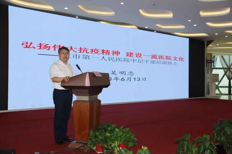 6月13日,连云港市第一人民医院举办中层干部培训班。我校文学院院长吴明忠下午应邀为全院干部作《弘扬伟大抗疫精神 建设一流医院文化》专题报告。