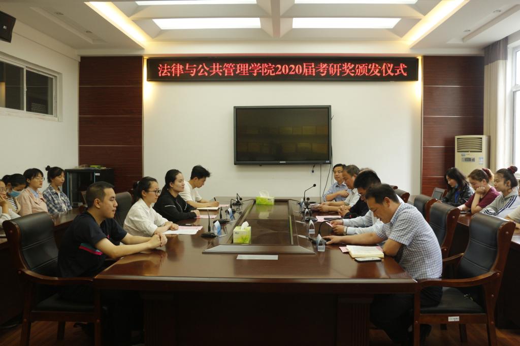 “老师,我考上复旦大学啦”,随着行管162班范桔慧同学的第一声喜报,法律与公共管理学院不断传来2020届毕业生考研“上岸”的喜讯。为表彰优秀,营造良好学风,法律与公共管理学院于6月18日上午在文渊楼216会议室举行了2020届考研奖颁发仪式。助学单位代表江苏连城律师事务所主任洪立东、江苏公善民律师事务所主任范江华,学院党总支书记朱国良、院长吴价宝、全体2020届“准”研究生同学、辅导员、毕业班班主任和低年级学生代表一同参加了此次仪式,仪式由院党总支副书记王国银主持。