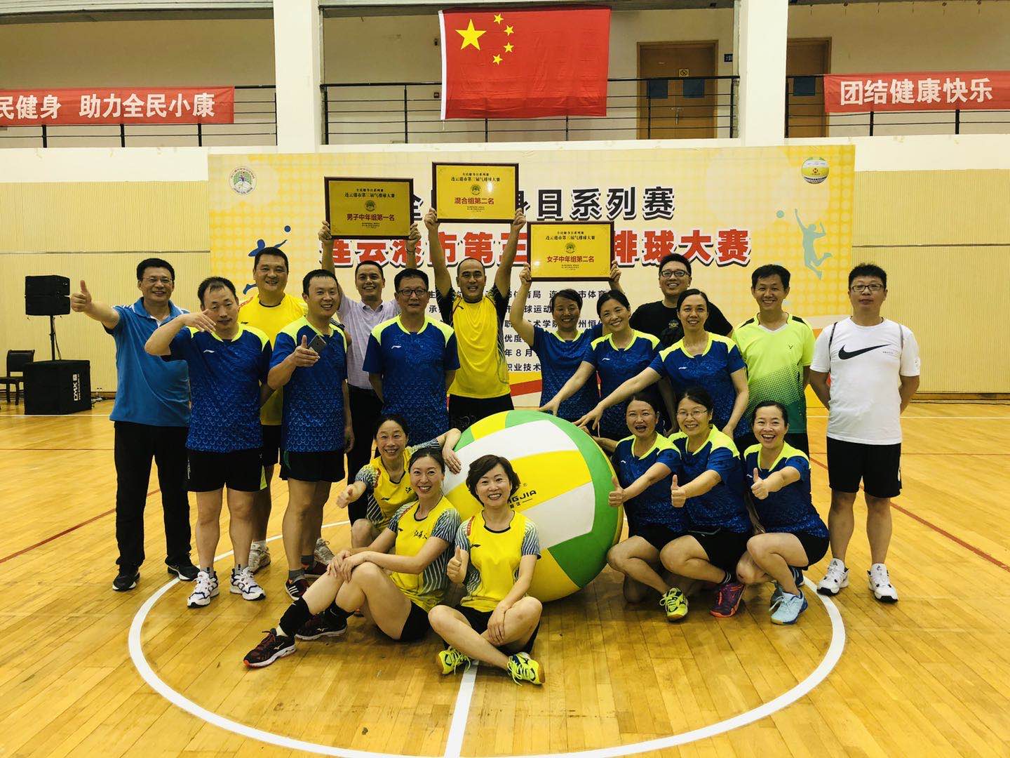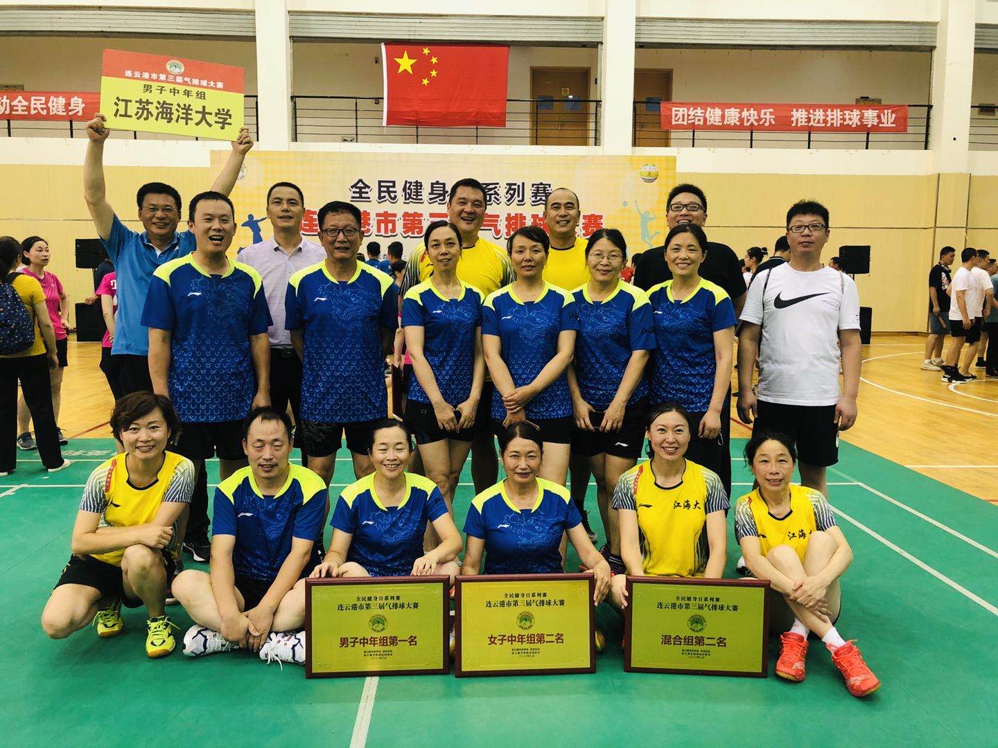 8月22日至23日,由连云港市体育局、连云港市体育总会主办,连云港市排球协会承办的全民健身日系列赛—连云港市第三届气排球大赛在连云港职业技术学院举行。经过两天的激烈角逐,我校教工排球协会组织的三个职工气排球队在中年男子组、中年女子组、混合组气排球比赛中获佳绩,取得三块奖牌。