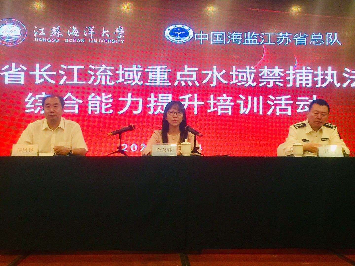 江苏海洋大学继续教育学院与中国海监江苏省总队合作举办“全省长江流域重点水域禁捕执法综合能力提升”培训班。2020年9月24日上午,在连云港市明珠开君国际酒店举行开班典礼,江苏海洋大学副校长金芙蓉出席并致辞,中国海监江苏省总队政委沈彦作了动员讲话,中国海监江苏省总队领导及来自全省六十多位渔业执法干部参加培训,继续教育学院院长杨凤和主持开班仪式。