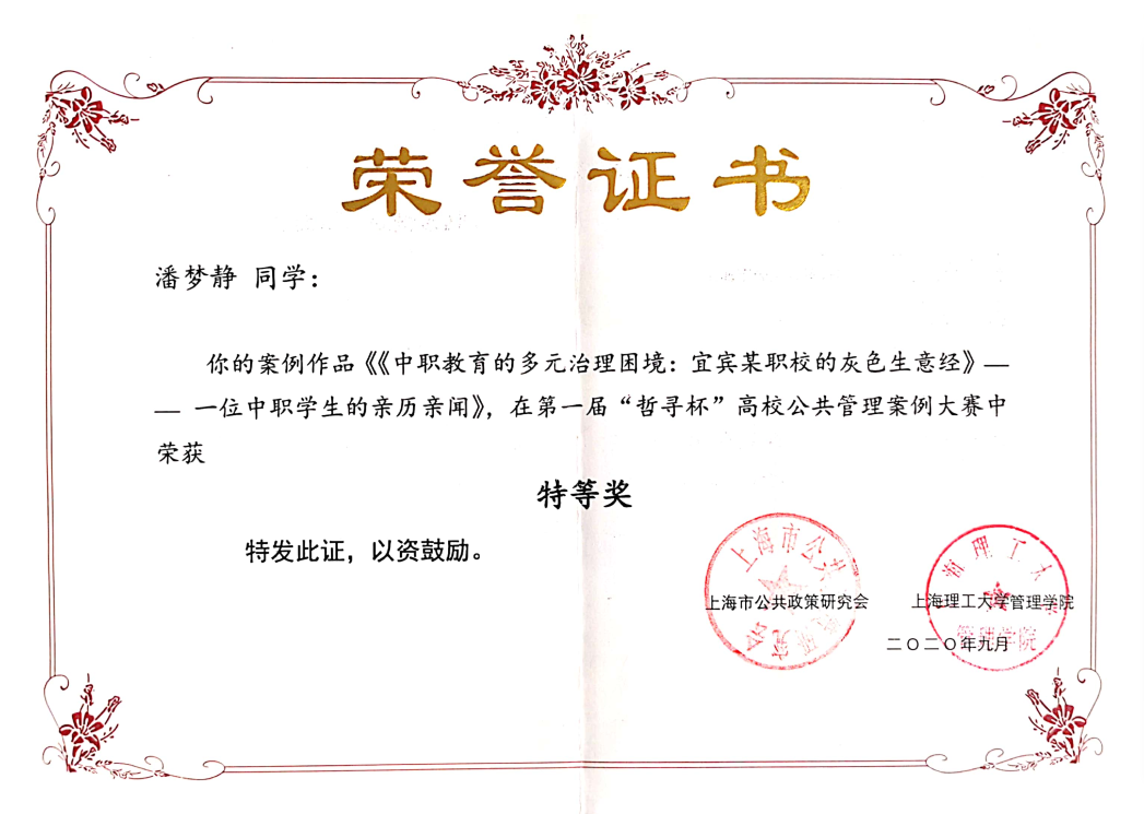 据悉,第一届“哲寻杯”高校公共管理案例大赛由上海市公共政策研究会、上海理工大学管理学院主办,华东师范大学政治学系、上海海关学院协办,上海哲寻信息科技有限公司赞助支持,大赛分为初赛和决赛两个阶段。初赛于2019年12月15日正式启动,共收到来自全国24个省市百余所高校的300多份参赛作品,经初赛评审组评选筛出45份作品进入决赛。因受疫情影响,演示和答辩均采用线上方式进行。我校共获得特等奖1项、二等奖2项、三等奖和优秀奖各1项。