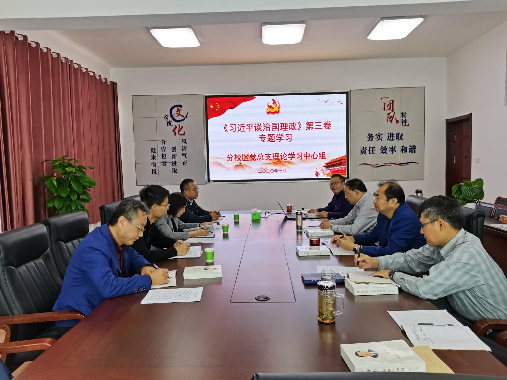 10月7日下午,分校区党总支书记张振松主持召开理论学习中心组学习会议,专题学习《习近平谈治国理政》第三卷。校党委常委、宣传部长杨雪英,组织部副部长韩振响等全程旁听了学习会议,总支委员以及各支部书记参加了学习。