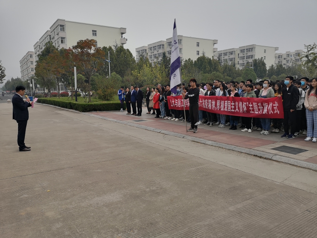 2020年10月12日清晨,土木与港海工程学院在苍梧校区四食堂前生活区广场举行“弘扬伟大抗疫精神,厚植爱国主义情怀”主题升旗仪式。学院全体党政领导、辅导员、班主任以及全体同学参加了升旗仪式。院党委副书记钱汉珍主持升旗仪式。