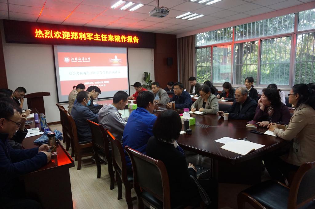 郑利军主任以“综合考核视角下的高等学校内涵建设”为题,从综合考核背景、当前教育形势、综合考核对学校的要求、综合考核重点四个方面对高校综合考核作了详细解读。他指出,综合考核具有动态性和针对性的特点,学校对学院的综合考核侧重考核学院的高质量发展成效、党的建设情况、满意度调查,并采用乘数计分法确保对学院的工作作出科学评价。