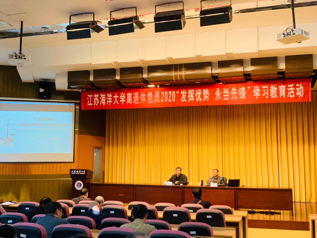 11月9日上午,离退休党工委在文博楼报告厅举行理论学习报告会。报告会由离退休党工委书记黄金虎主持,近九十名离退休党员和离退休工作处全体工作人员参加了学习。首先,校党委理论宣讲团成员、文法学院吴建国博士作题为“以法治现代化推进国家治理体系和治理能力现代化”的专题报告,报告从人类对法治文明的探寻、中国法治建设的背景、发展阶段及存在的问题进行了深入阐释。随后,黄金虎以“发挥优势,永当先锋,为学校高质量发展积极作贡献”为题为全体党员上党课。黄金虎紧紧结合党的十九届五中全会精神、中央和省委以及学校党委有关文件内容,从高度重视离退休党员的独特优势和积极作用、如何充分发挥老党员的先锋模范作用、不断完善老党员发挥作用工作机制三个方面展开探讨,他希望广大老党员永葆爱党本色,充分发挥政治优势、经验优势、威望优势,永当先锋模范,充分发挥“传帮带”作用,为学校高质量发展做出新的贡献。