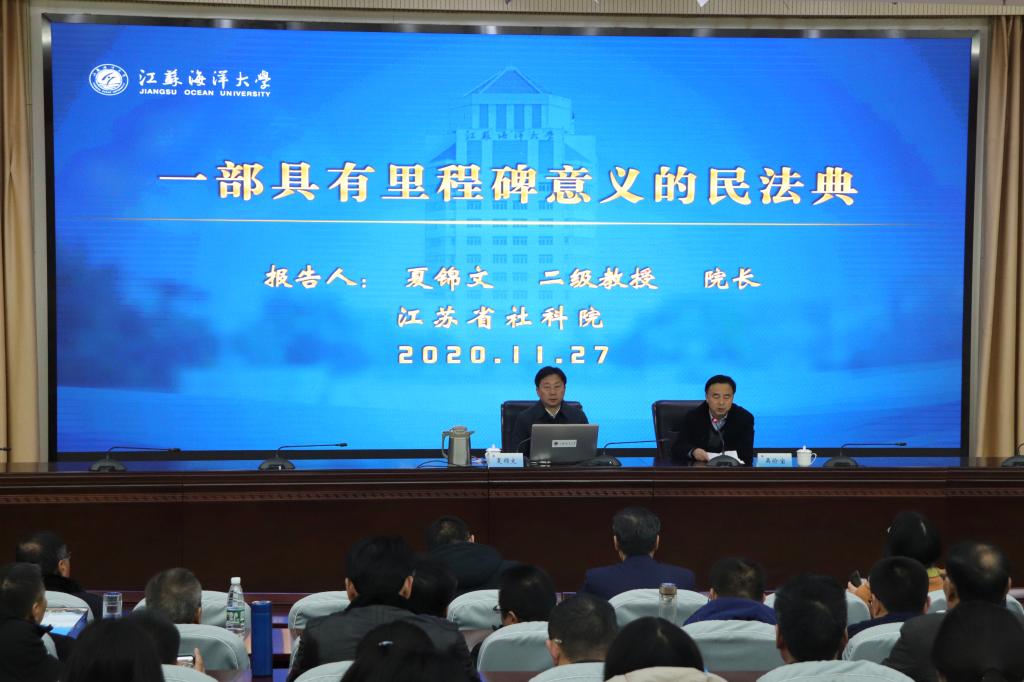 11月27日上午,文法学院在会议中心黄海厅举办了《中华人民共和国民法典》(以下简称《民法典》)讲座,讲座由江苏省社会科学院党委书记、院长夏锦文教授主讲,文法学院党委书记吴价宝教授主持,文法学院法学系师生现场聆听了讲座。