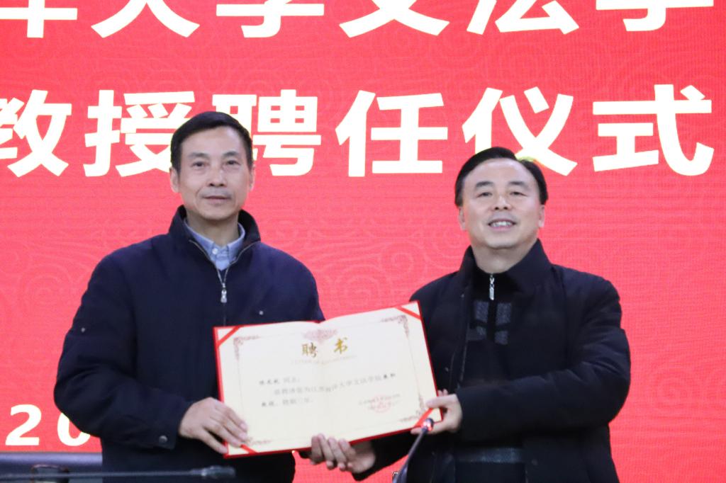 文法学院党委书记吴价宝为陈龙乾颁发了文法学院兼职教授聘书,并代表全院师生对陈龙乾表示热烈欢迎和衷心感谢。