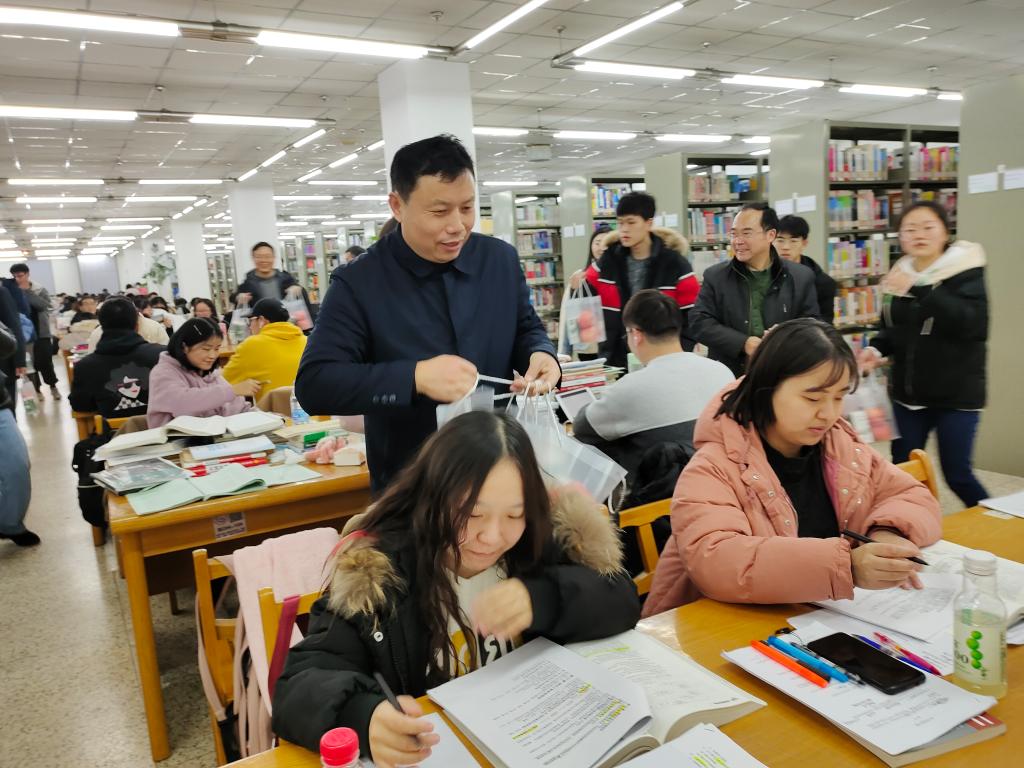 距2021年全国硕士研究生招生考试仅剩15天,为助力考研学子,鼓励大家积极迎考,12月10日晚,校党委常委、副校长金芙蓉和学生工作处、图书馆负责人一行先后来到图书馆、文思楼考研教室看望慰问考研学生,为正在紧张备考的学子送去祝福与慰问。