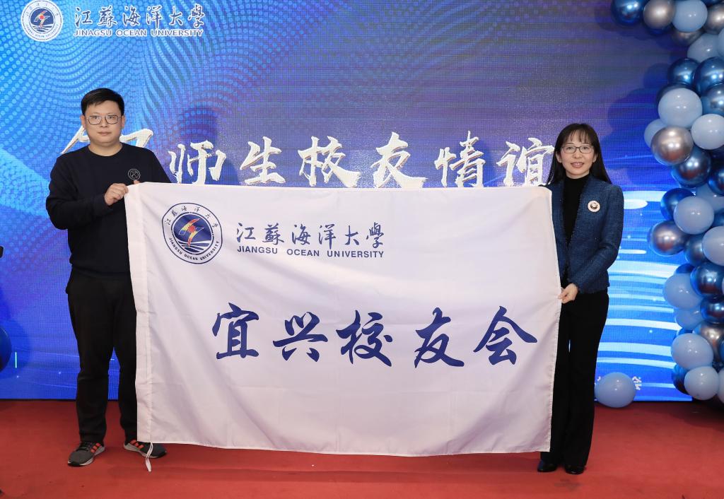 副校长金芙蓉向苏诚会长授予江苏海洋大学宜兴校友会会旗和会牌