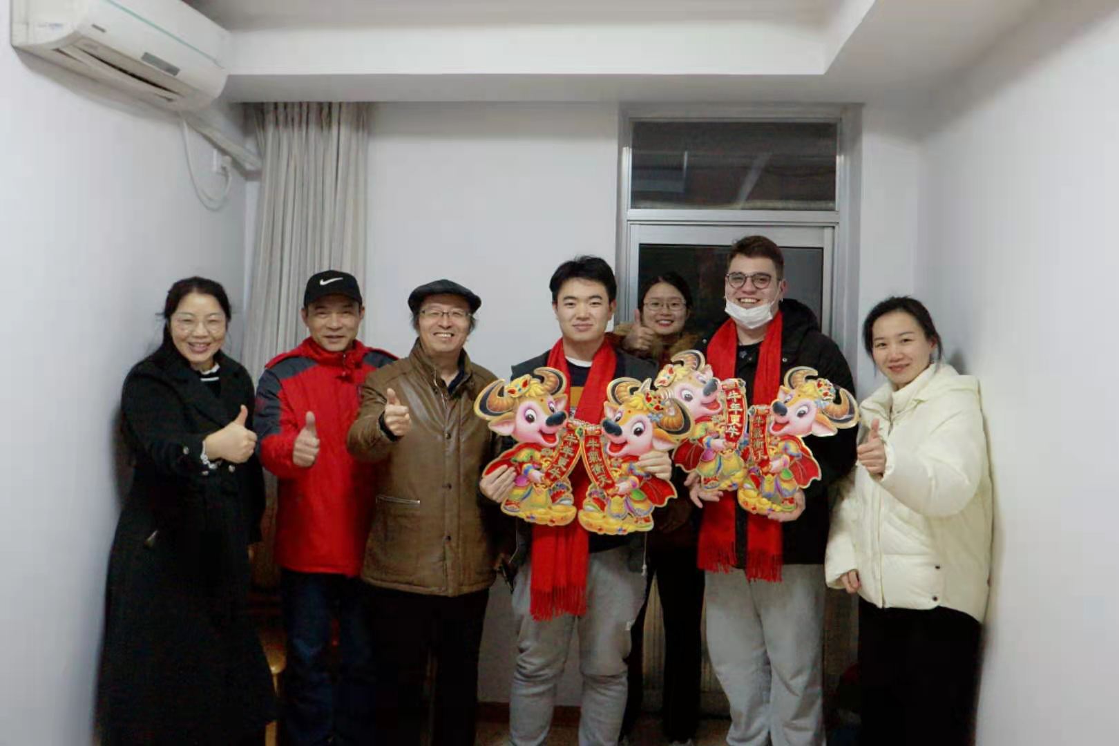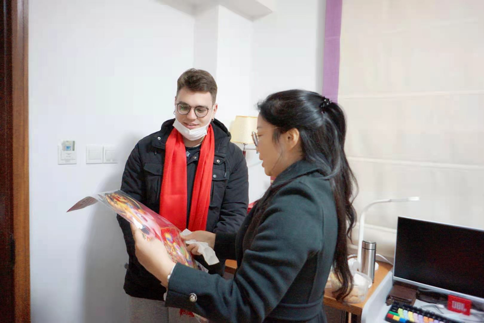 老师们为留校过年的河北籍学生和留学生准备了牛奶、水果、点心等暖心大礼包,亲自为他们围上大红喜庆的围巾,张贴“牛气冲天”的年画,王晶还专门制作了香喷喷的大肉饼。每到一处,老师们和留校生亲切攀谈,嘘寒问暖,捎去新春的问候和祝福,让他们感受到家庭般的温馨。