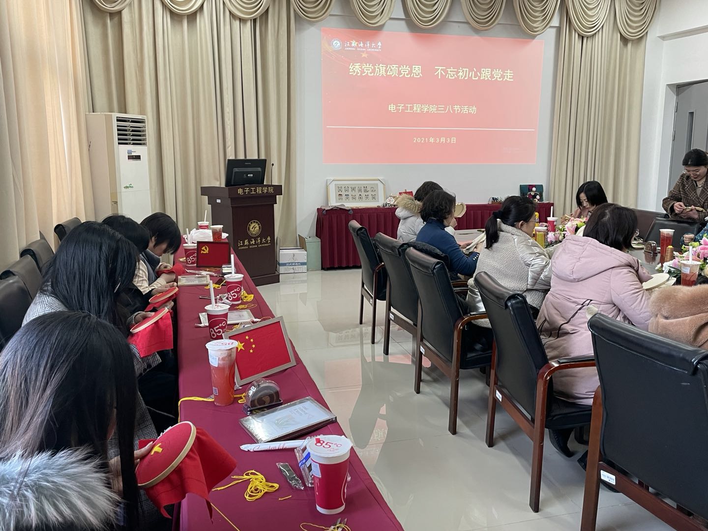 3月3日下午,电子工程学院27名女教师齐聚电子楼314会议室同绣党旗、共颂党恩,庆祝“三八”妇女节、献礼党的百年华诞。
