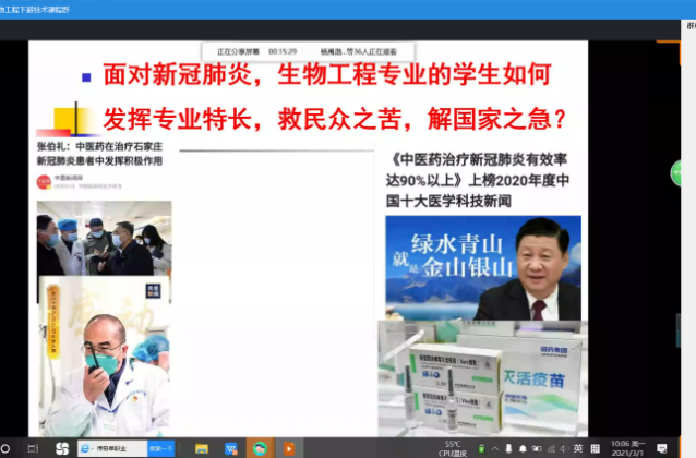 药学院做了充分的准备工作,对各个授课平台进行了测试。学院高度重视对在线教学运行情况的监督和检查,自3月1日开始线上教学以来,对学院开设的每一堂课都安排了督导听课,检查教师教学和学生学习情况,解决上课过程中产生的突发问题;所有课程都按照课程表开展教学,教学秩序井然。教学过程中老师们积极采用多种教学方法,活跃课堂气氛,提高教学效果。比如多次穿插提问,除要求集体回答外,还会点名要求其中的某位同学单独回答,既实现了比较好的课堂互动,又较好地督促学生提高注意力。