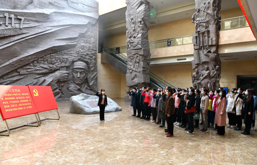 在革命纪念馆,副校长金芙蓉带领所有在场的党员重温了入党誓词。