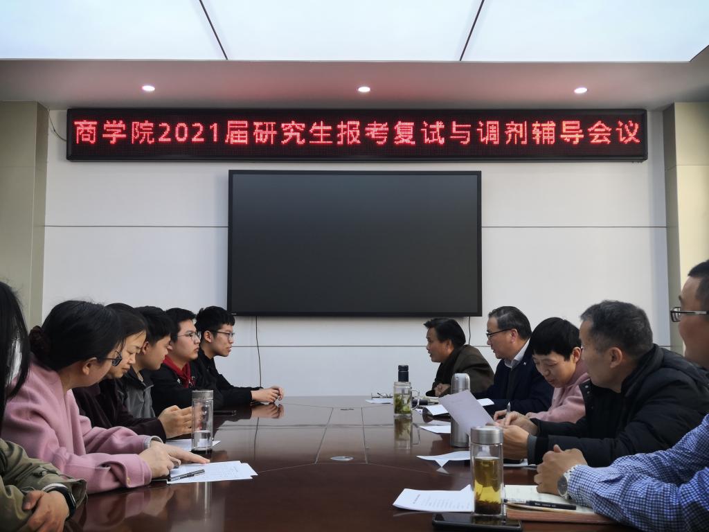 为助力2021届考研上线学生更好地准备复试和调剂,提高复试和调剂成功率,3月24日下午,商学院在文渊楼355会议室组织了复试与调剂辅导会。学院党委书记杨天华,院长宣昌勇,商学院全体系主任,以及2021届考研达线学生参加了辅导会,辅导会由学院党委副书记王智金主持。