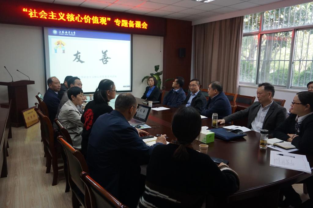 深入贯彻落实《江苏海洋大学2021年大学生社会主义核心价值观教育工作方案》,提升社会主义核心价值观专题教学水平,增强课程感染力和亲和力,4月28日下午,“社会主义核心价值观”专题备课会在马克思主义学院举行。校党委书记王自力、党委副书记史顺良、副校长严云洋、组织部部长纪延光、宣传部部长杨雪英以及马克思主义学院骨干教师等社会主义核心价值观宣讲团成员参加了备课会。备课会由宣传部部长杨雪英主持。