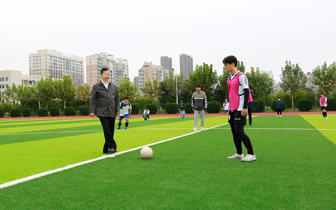 启用仪式结束后,新建运动场迎来首场赛事——应用技术学院”2021.迎新杯”足球联赛“,宁晓明亲自为首场比赛开球。赵宏为学生长跑队鸣枪发令起跑。