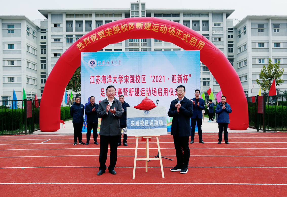 10月20日下午,我校宋跳校区运动场新建工程圆满完成全部建设任务。校长宁晓明为“江苏海洋大学宋跳校区运动场”揭牌,宣布宋跳校区新建运动场正式启用。体育学院院长赵宏,学院领导丁兆奎、赵求勇、李明金、隋福利、时树奎,全体教职工,学生足球队、篮球队、排球队、羽毛球队、乒乓球队、太极拳队代表及师生长跑队代表共同见证这一激动人心时刻。学院党委书记赵求勇主持仪式。