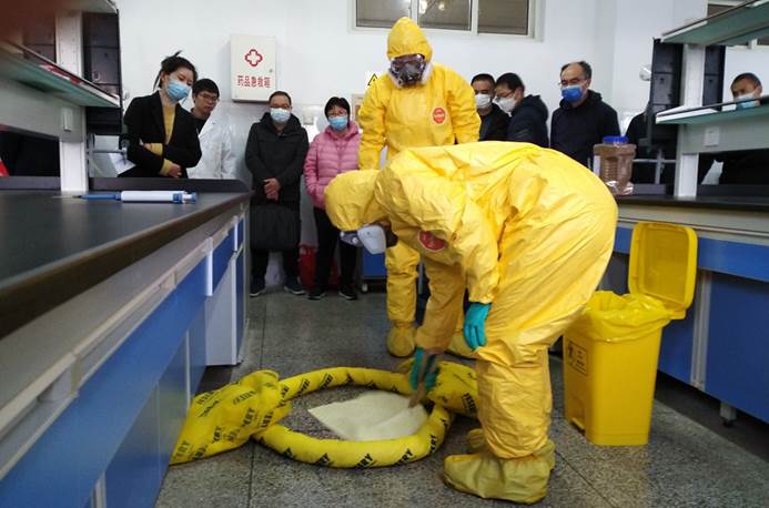 活动第三阶段,实验室安全事故应急演练在化工楼南四楼开展。本次实验室安全应急演练内容包括“灭火毯的使用”与“盐酸泄漏泼洒实验地面的应急处置”两部分。现场生动模拟了少量盐酸泄漏后,人员的有序撤离、现场封锁、事故危害评估、事故有序上报、应急救援人员的个人防护、消除危险源、现场恢复、事故发生后的调查与评估等规范化应急处置流程。严云洋和相关学院师生代表现场观摩,部分师生参与模拟演练。