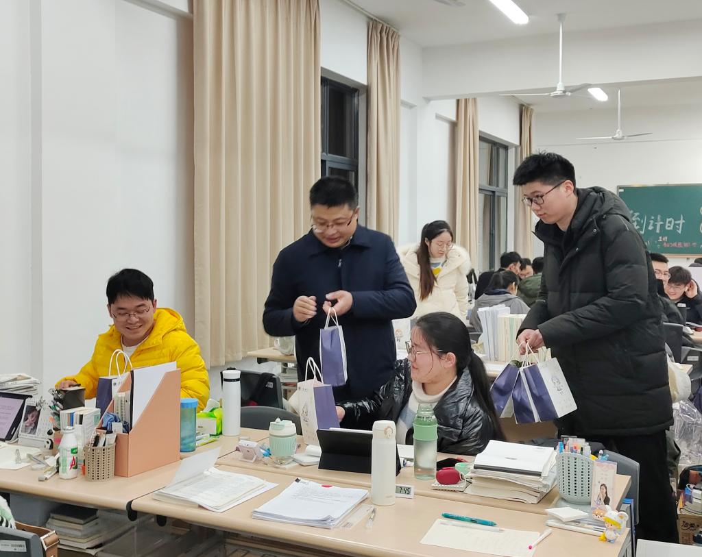 凛凛寒冬递温暖。12月16日晚,校党委常委、副校长朱国军和学生工作处、图书馆负责人一行再次来到图书馆、文思楼考研教室,为正在冲刺备考的同学们送去了“牛”气冲天、“橙”功上岸大礼包和学弟学妹们的亲笔祝福。“牛”气“橙”功增底气,话语铿锵鼓士气。距离考试愈发近了,有了学校的暖心助力,同学们的底气、士气更足了。