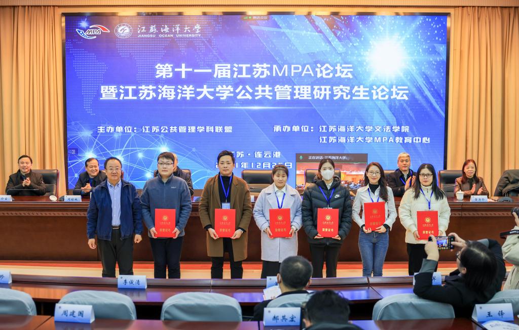 群贤汇聚江海,少长咸集云台。12月26日,第十一届江苏MPA论坛暨“江苏海洋大学公共管理研究生论坛”在会议中心举行。副校长、MPA教育中心主任许兴友教授,全国MPA教指委委员、中央民族大学李俊清教授,教育部长江学者、南京审计大学金太军教授,全国公共管理类专业教学指导委员会委员、南京特殊教育师范学院管理学院院长杨会良教授,江苏MPA论坛秘书长、江苏大学周绿林教授,河海大学公共管理学院院长黄涛珍教授,江苏海洋大学文法学院党委书记、MPA教育中心副主任吴价宝教授出席会议。文法学院院长吴明忠主持会议。