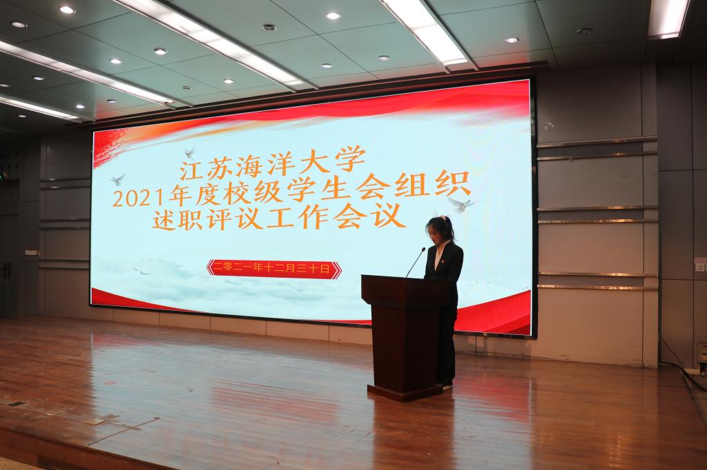 12月30日下午,江苏海洋大学2021年度校级学生会组织述职评议工作会议在苍梧校区艺术楼报告厅顺利进行,党委学生工作部、党委研究生工作部、团委等部门负责人出席述职评议会议,20余名本科生代表、研究生代表参加评议会议。