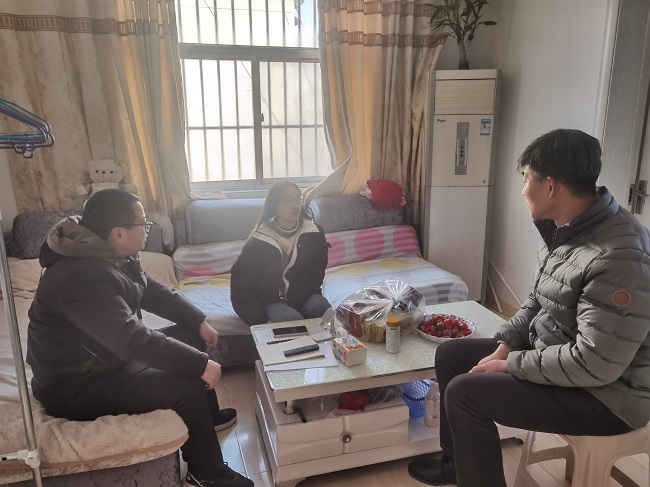 1月20日上午,食品科学与工程学院党总支书记田德勇、副书记郭利和辅导员吴凡来到海州区新龙新村,走访看望寒假留连学生陈恋,表达节日的问候和新年的祝福。