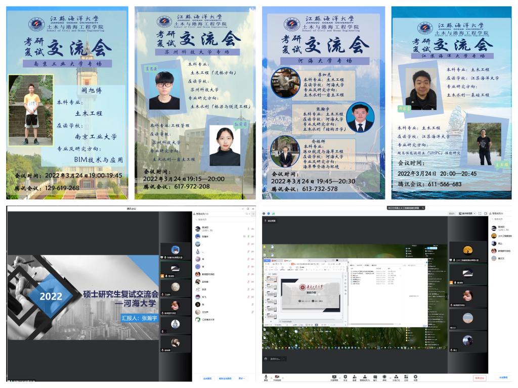 举办四场专场考研复试交流会。分别由河海大学、南京工业大学、苏州科技大学和江苏海洋大学在读的研究生校友对报考该校的考研复试学子们点对点手把手进行指导。