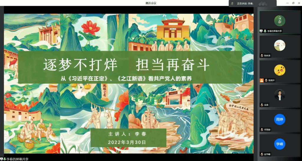 3月30日晚,艺术设计学院党总支书记李春以“逐梦不打烊,担当再奋斗”为主题开展了一次线上党课培训。李春分享了阅读《习近平在正定》《之江新语》两部经典红色书籍后的深刻感悟,为学院学生第一、第二党支部全体学生党员上了一堂生动的党课。学院党总支副书记王欢、副处级组织员吴良军、辅导员敖燕环、徐熙檳一同参加了学习。