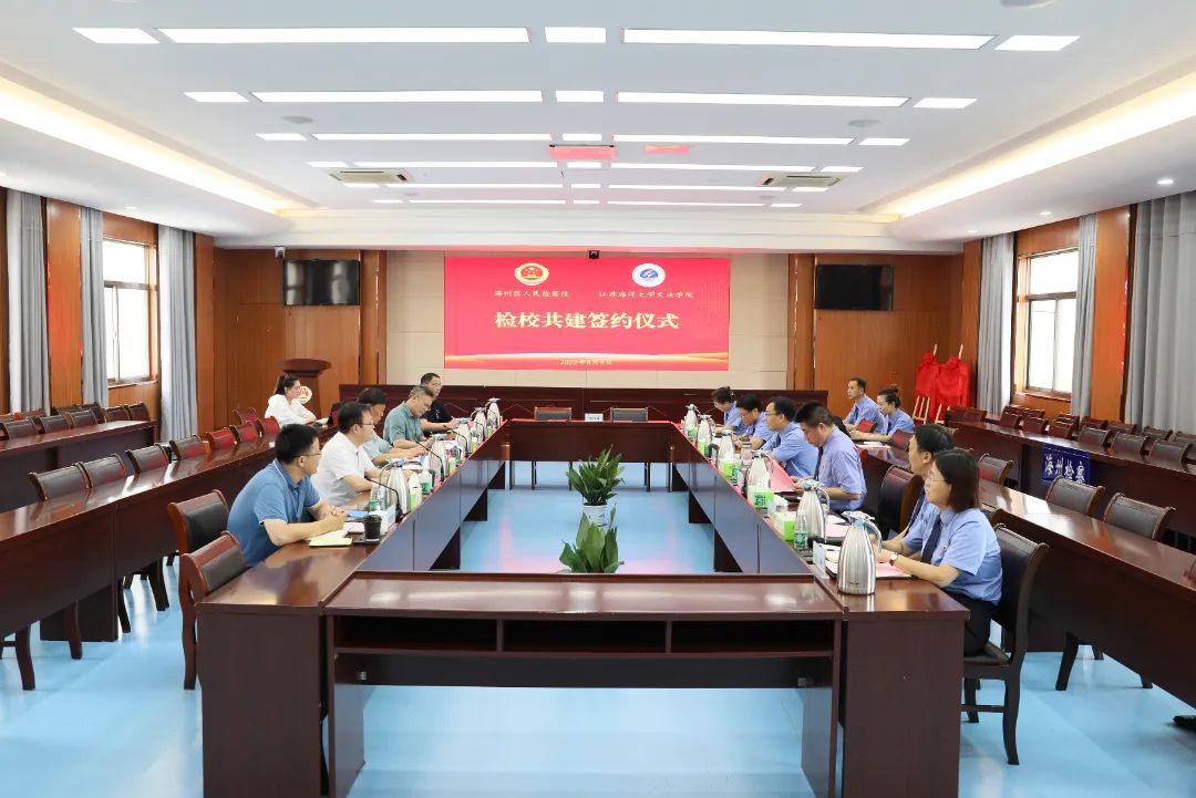 张立检察长和吴明忠院长签署检校共建协议书,和魏范青书记共同为“实习实践基地”“检察理论研究与实践基地”揭牌。校检双方就如何发挥各自优势、加强理论研究和实践探索方面的合作进行了交流。大家还参观了海州区检察院融媒体、政治实践基地、海州古城公益保护展厅等检察文化场所。