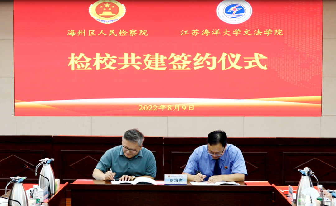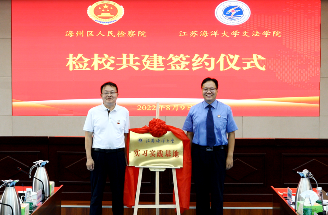 8月9日下午,文法学院与海州区人民检察院举行检校共建签约暨“实习实践基地”揭牌仪式。校教学督导组组长刘平昌、文法学院院长吴明忠、文法学院党委书记魏范青、法学系党支部书记孙登科、法学系系主任许胜晴和海州区人民检察院领导班子成员参加签约揭牌仪式。