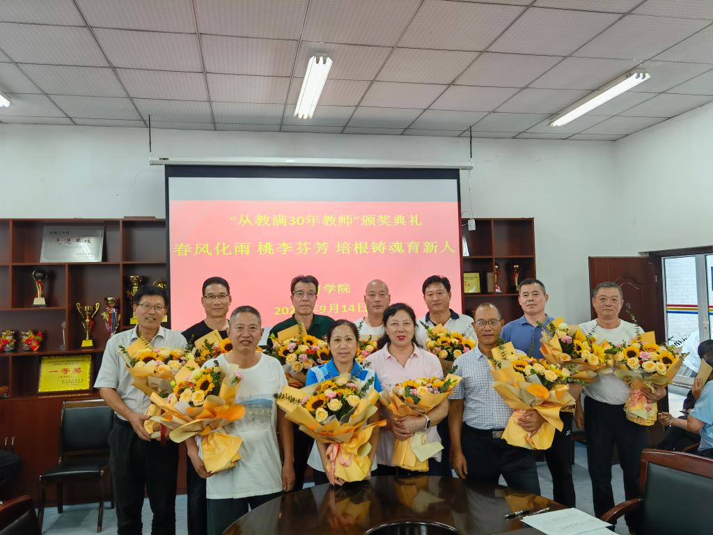 9月14日下午,体育学院在会议室举行“春风化雨桃李芬芳培根铸魂育新人”从教满三十周年教师颁奖典礼。典礼由党总支书记张萍主持,学院领导班子及全体教职工参加了颁奖典礼。