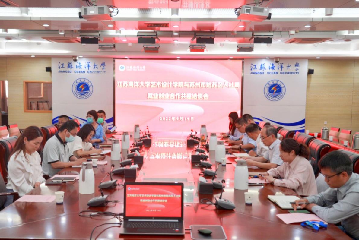 为了进一步拓宽学院毕业生就业渠道,更好的开展产学研合作,服务地方经济发展与乡村振兴,9月19日下午,艺术设计学院与苏州市姑苏区人力资源和社会保障局、苏州市姑苏区沧浪街道,在学术会议中心东海厅开展了大学生就业创业合作共建活动,姑苏区人社局副局长薛梅、姑苏区沧浪街道党委副书记孙远带领相关部门工作人员及4家企业负责人等一行9人出席共建洽谈会,校招生与就业处处长马恒通、学院领导班子成员及教师代表,以及省委驻赣榆区乡村振兴工作队队员杨殿闯(我校教师)、陈雨峰(沧浪街道)一同参加共建活动。活动由院党总支副书记王欢主持。