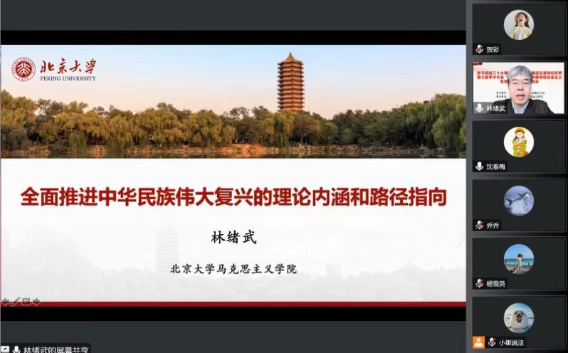 北京大学马克思主义学院教授林绪武作主旨报告。林绪武以“全面推进中华民族伟大复兴的理论内涵和路径指向”为主题,从“全面推进中华民族伟大复兴的演进历程”“中国特色社会主义是实现中华民族伟大复兴的必由之路”“以中国式现代化全面推进中华民族伟大复兴”“全面推进中华民族伟大复兴关键在党”四个方面对党的二十大报告作出了深刻阐述。他认为,党的二十大报告蕴含着关于全面推进中华民族伟大复兴的理论内涵和路径指向,彰显了中国化时代化马克思主义的世界观和方法论。