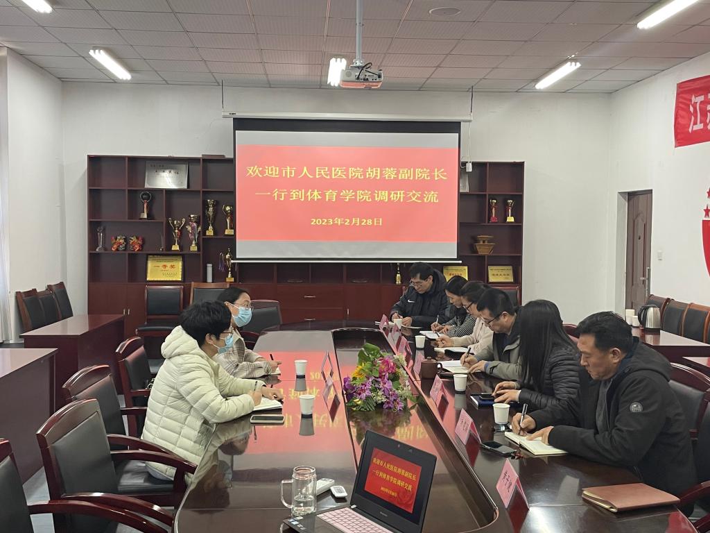 赵宏代表体育学院对胡院长一行的到来表示欢迎。胡蓉介绍了连云港第一人民医院的基本情况。希望通过双方合作,借助医院运动医学和康复学等学科力量,充分发挥医疗诊疗优势,利用江苏海洋大学体育学院平台,实现科研创新合作和医体科研平台的搭建。
