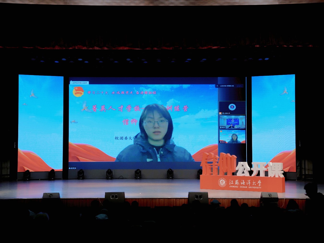 为深入学习宣传贯彻党的二十大精神,落实立德树人根本任务,引导广大青年在学思践悟中坚定理想信念,在奋发有为中践行初心使命。3月23日晚,江苏海洋大学“学习二十大 永远跟党走 奋进新征程”主题信仰公开课暨菁英人才学校第三期深蓝训练营活动在苍梧校区大礼堂顺利举行。2022级班长、团支书及学院团委干事等400余人参与了本次活动。