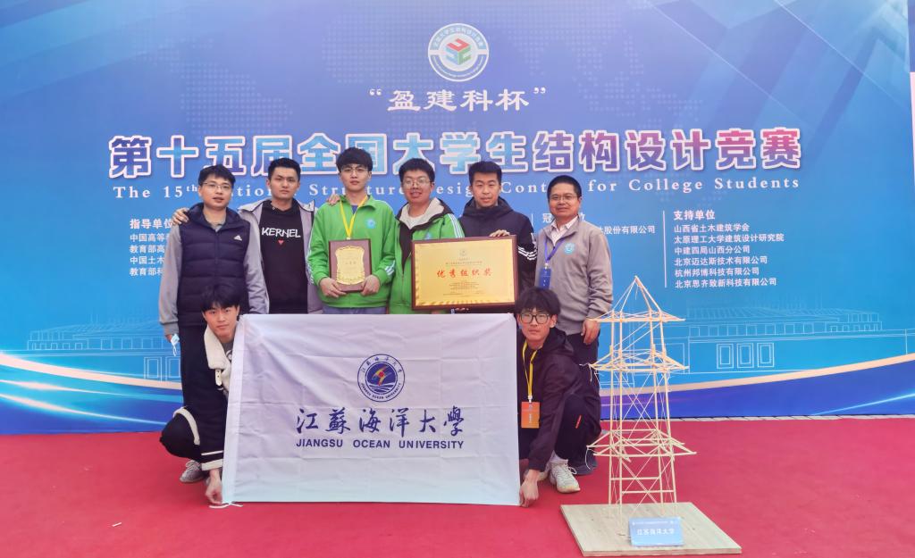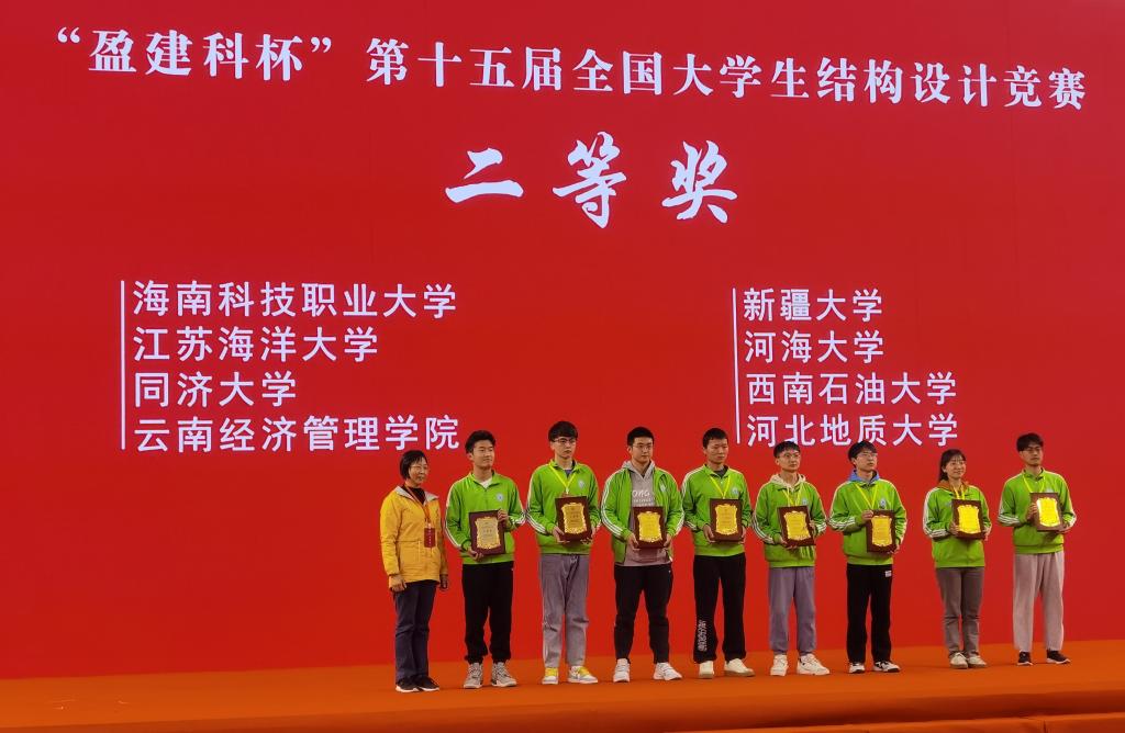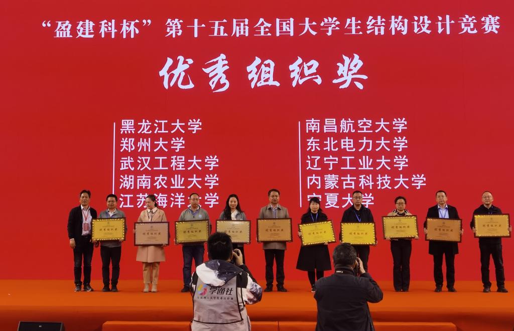 本届大赛题目模型基于“应县木塔”背景,以三重木塔结构为基本单元,要求参赛者在16小时内针对竖向荷载、扭转荷载及水平荷载等多种荷载工况下的空间结构进行受力分析、模型制作及加载试验。我校土木与港海工程学院代表队以四柱压杆为框架结构主体,利用挑檐拉条加强节点抗拉强度、抗扭压杆加固等技术,运用装配式节点为插销承受剪力和拉力。经过方案论证、规避检验、现场陈述及加载试验等环节,我校代表队最终在111支参赛队伍中喜获全国二等奖,同时荣获竞赛委员会优秀组织奖。这是我校在土木专业类获得的最高荣誉。