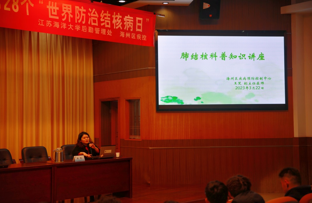 3月22日,后勤管理处特邀海州区疾控专家王笑在讲堂楼报告厅,给土木学院的学生进行了专场讲座,并在现场开展了结核病知识有奖竞答活动,现场气氛活跃,收到了良好效果。