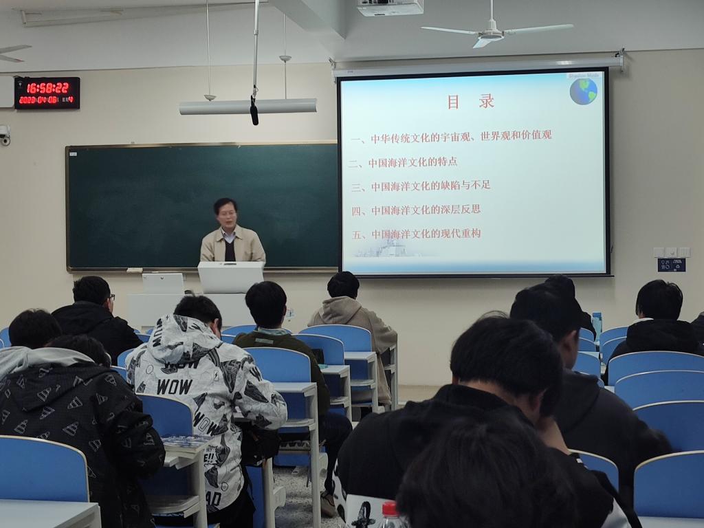4月6日下午,江苏海洋大学中国近现代史研究中心邀请中船重工七一六研究所胡志强教授来我校为学生做海洋文化专题讲座。胡志强教授首先为同学们介绍了中华传统文化的宇宙观、世界观和价值观,分析了传统文化重视土地价值、轻视海洋价值的特点。接着,胡教授从文化史观的角度,分析了中国海洋文化以农渔为本、迷信和宗教性合二为一、地域特色浓厚、航海贸易印迹较少等四个方面特征,并详细阐述了形成以上特征的原因,包括缺乏工商业经济的支撑、过度的迷信和宗教性、统治者政策影响等内容。最后,胡教授对中国海洋文化的建构提出了五点意见与对策。