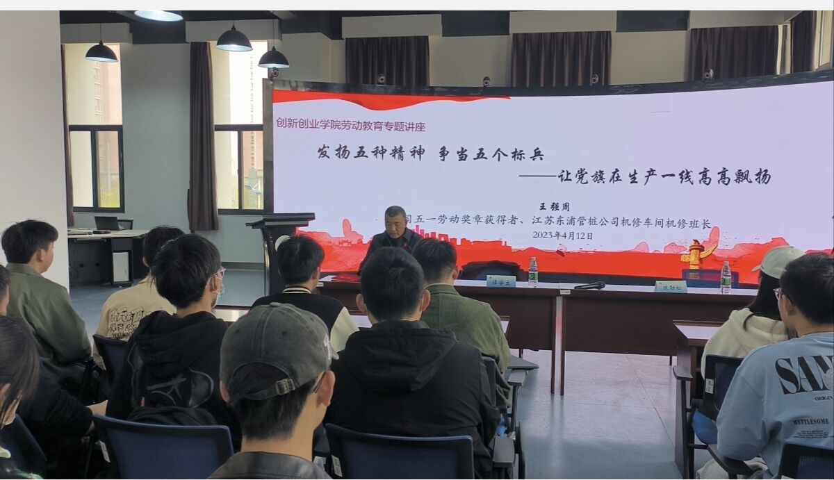 4月12日下午,创新创业学院在定海楼s201举办“以劳树德,以劳增智,以劳创优”劳模进课堂主题教育活动。全国建材行业管理创新突出贡献人物、江苏东浦管桩公司党委书记谭学立,全国五一劳动奖章获得者、江苏东浦管桩公司机修车间机修班长王强周作为主讲嘉宾,学院2020-2022级全体学生参加,创新创业学院常务副院长陈劲松主持活动。