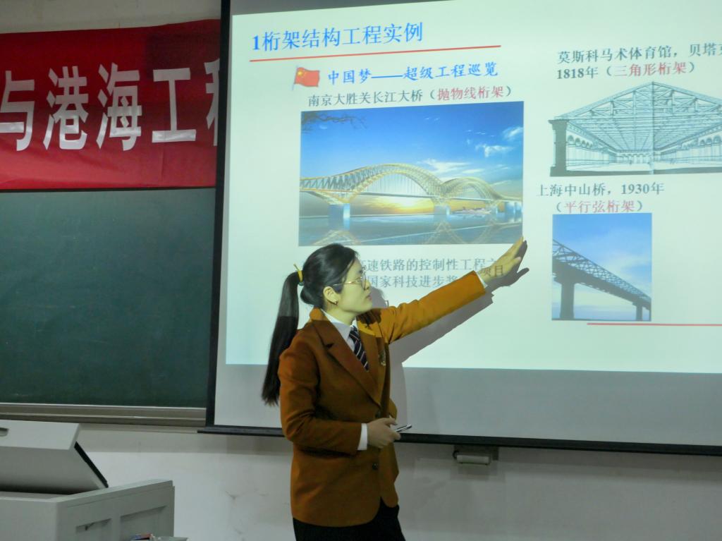 比赛现场,参赛教师分别从教学目标、内容、方法及手段等方面提出课堂教学设计方案,并结合相应课程实际进行了精彩的教学展示。教学展示过程巧妙融合课程思政及现代信息技术教学手段,教学风格别具一格,让人耳目一新。授课内容与时俱进,丰富多彩,涵盖了建筑学、岩土工程、桥梁工程、水运工程、海岸工程等多门核心课程。张楚旋老师结合航天空间站中桁架结构的应用,帮助学生提升力学学习的使命感和自豪感。成小飞老师结合港珠澳大桥人工岛的防护堤,讲述了护面块体的施工要点,理论联系实际成效显著。