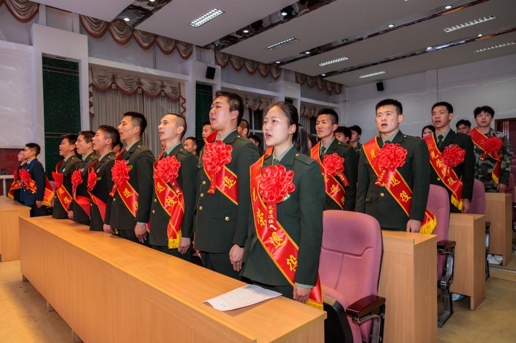 海州区人武部政工科科长杨志宣读退役大学生名单。“王艺彭”“到!”“赵曾轩”“到!”。。。。。。一声声坚定有力的“到!”在会场中回荡,激奋人心,此刻,军人永不磨灭的意志品质在他们的身上熠熠闪光。