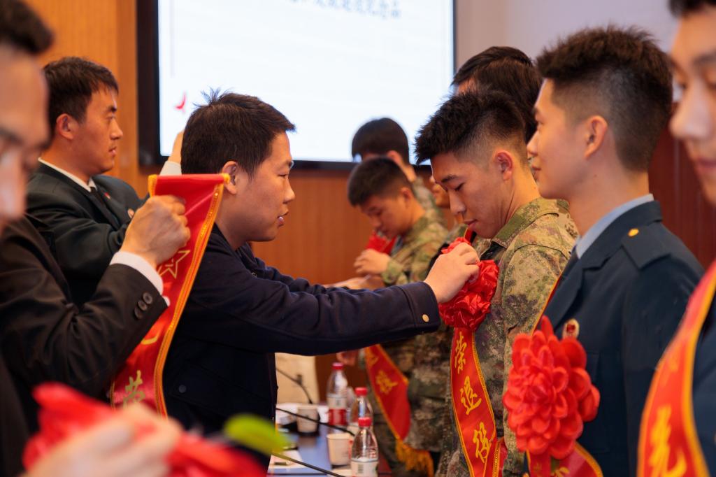 会上,与会领导为退役大学生一一佩戴光荣红花,并赠予退役纪念品。