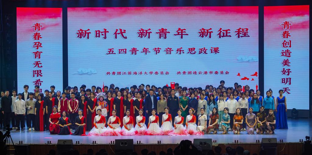 “让初心薪火相传,把使命永担在肩,愿以吾辈之青春,守护盛世之中华”,新时代海大青年奏响了奋进新征程的强音。5月4日晚,江苏海洋大学“新时代 新青年 新征程”五四青年节音乐思政课在苍梧校区大礼堂成功举办。校领导金芙蓉、朱国军,连云港警备区动员处上校处长、市征兵办主任姜齐与1000余名师生共同参与活动。