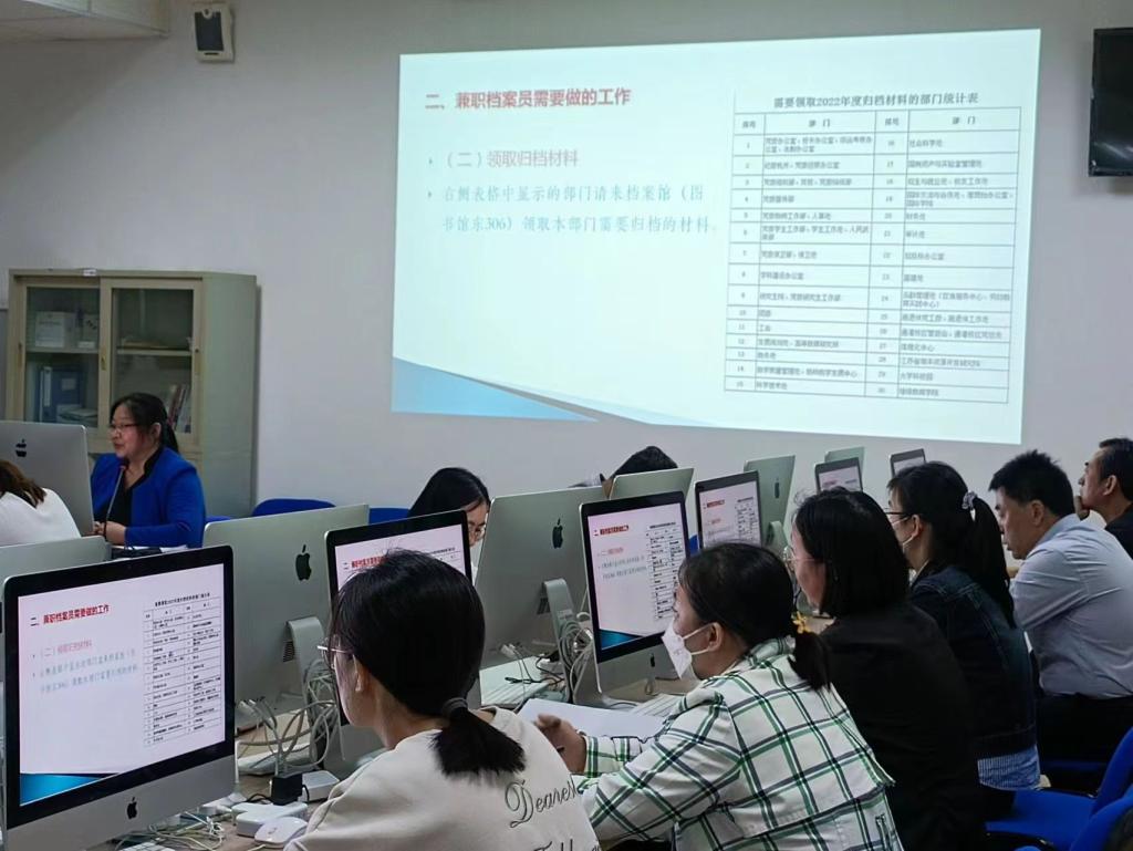 为做好2023年全校档案立卷归档工作,保质保量完成归档任务,5月9日下午,综合档案馆在计算机楼103教室召开兼职档案员培训会议。各二级单位和部门的兼职档案员参加培训会,会议由综合档案馆馆长田为付主持。