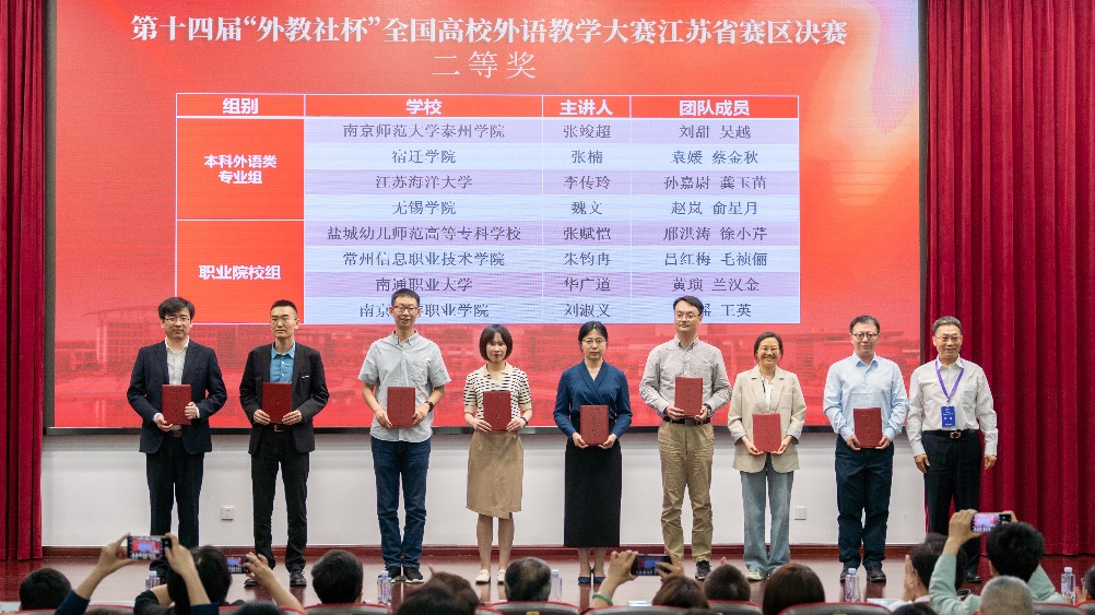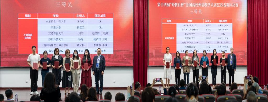 5月11日至13日,第十四届“外教社杯”全国高校外语教学大赛江苏赛区决赛在宿迁学院举行,外国语学院派出四组团队参赛。经过初赛、复赛的激烈角逐,三组参赛团队以优异成绩成功晋级决赛。李传玲教师团队(李传玲、孙嘉蔚、龚玉苗)获得“本科英语专业组”二等奖,刘伟教师团队(刘伟、赵晶辉、王晓红)获“大学英语综合组”三等奖,路剑虹教师团队(路剑虹、蔡源玥、张勇)获“大学日语组”三等奖。