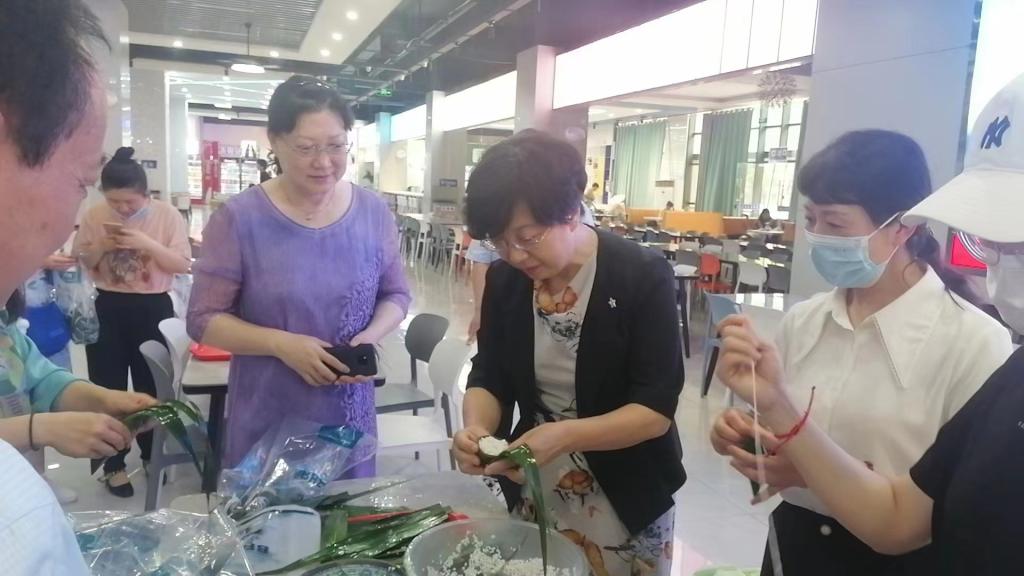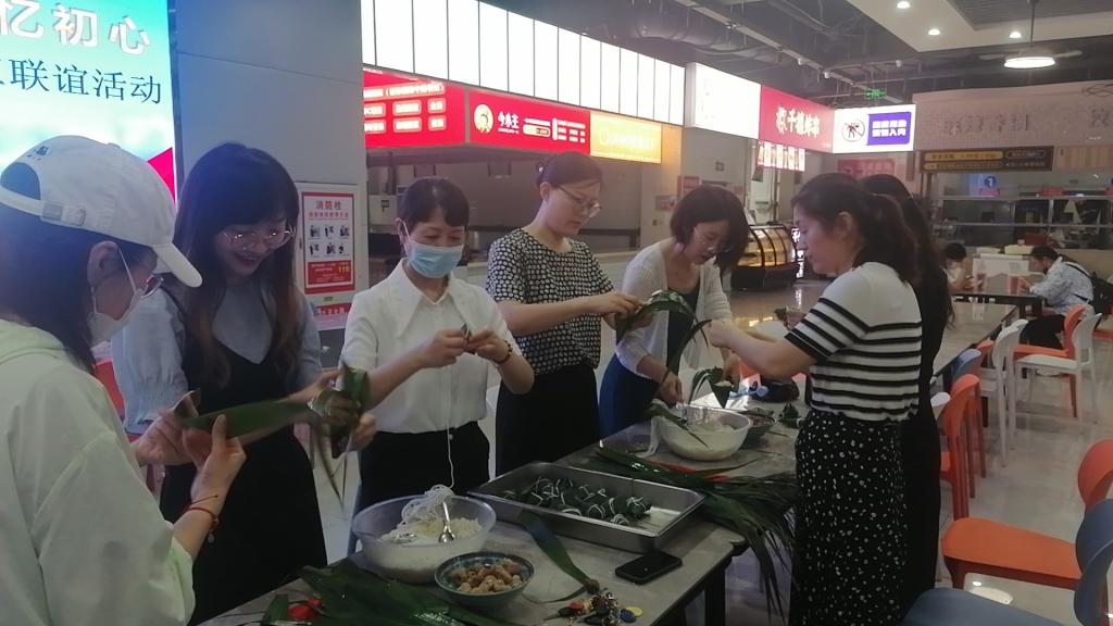 参加活动的教职工在食堂师傅指导下,认真学习包粽子方法和要领,大家互帮互学,其乐融融。很快,在一片欢声笑语中,一个个粽子便堆满了餐盘。